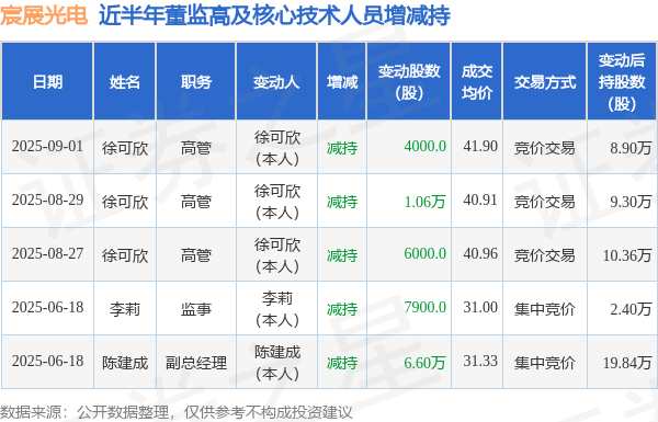 宸展光电近半年内的董监高及核心技术人员增减持详情如下: